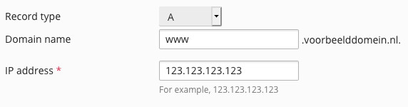 Voor een A-record zal je het dan moeten invullen op de volgende manier.