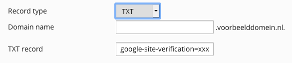 TXT-records zijn wat vrijer in te vullen records, je kan er ook meerdere hebben binnen je domein en deze worden voor verschillende doeleinden gebruikt, zo worden deze records gebruikt om bijvoorbeeld de eigendom van je domein te verifiëren bij Google’s Webmasters/Search Console/Analytics.