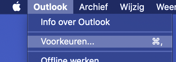 Open Outlook, klik in de bovenbalk op [Outlook] en kies voor [Voorkeuren]: