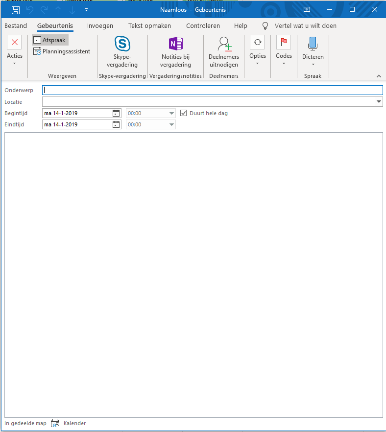 Als je hebt ge-dubbel klikt krijg je dit scherm, hier kan een afspraak en vergadering worden gemaakt. Hier kan je ook mensen toevoegen aan een afspraak en vergadering door bovenin op “deelnemers uitnodigen”. Door het vinkje “duurt hele dag” uit te vinken kan je ook tijd aangeven.